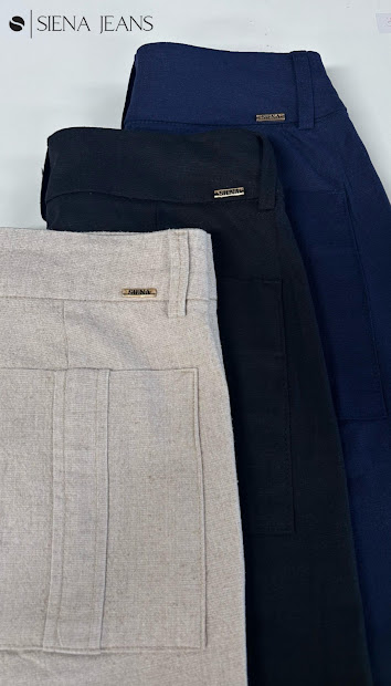Possui bolsos faca na parte frontal e bolsos traseiros, garantindo funcionalidade sem abrir mão da elegância.