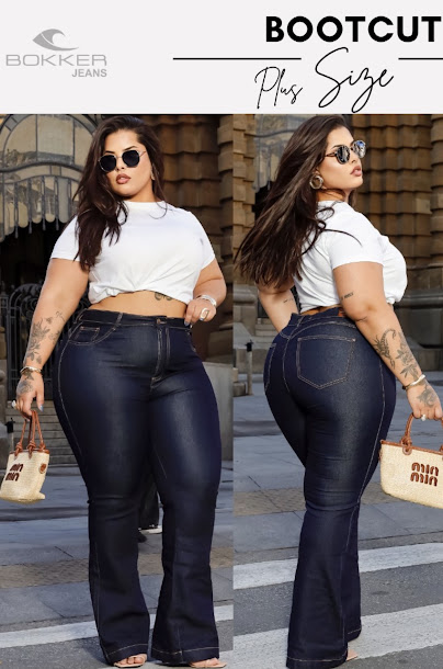 Calça bootcut plus size em jeans de lavagem tradicional com lycra, que proporciona caimento confortável e liberdade de movimento.