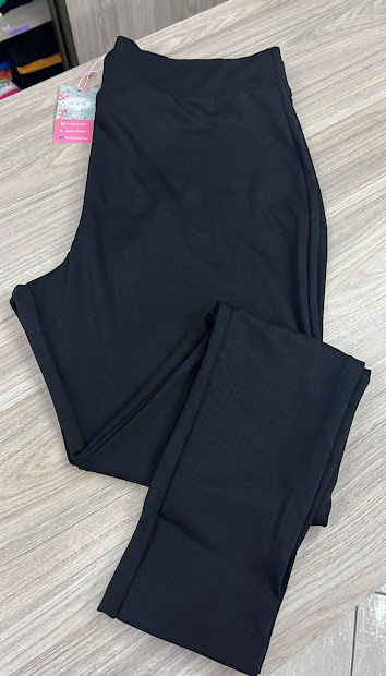 Calça legging plus size em malha ponto Roma, com cós de elástico largo e reto que garante maior firmeza e conforto.