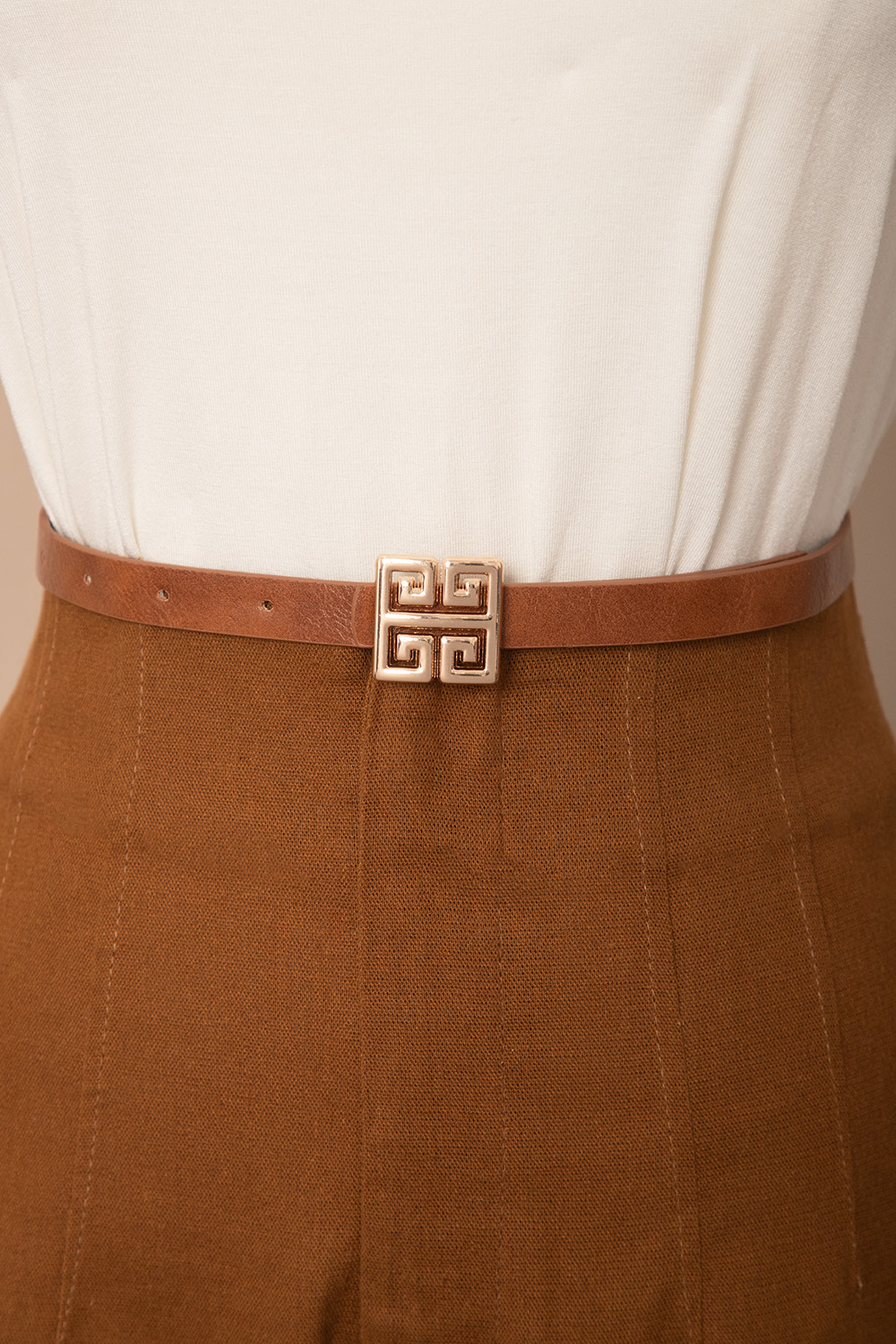Cinto sofisticado com fivela quadrada dourada de design geométrico, um toque de luxo minimalista que eleva qualquer look com um charme moderno e inconfundível.
