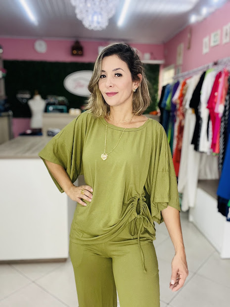 A blusa conta com manga morcego e detalhe de amarração lateral, trazendo um toque moderno e despojado ao visual.