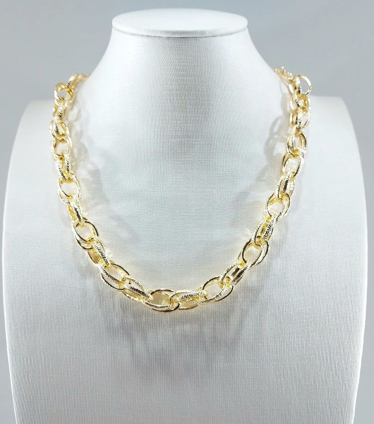 Corrente com elos maxxi delicados entrelaçados entre si, trazendo um toque moderno e elegante para compor diferentes produções.