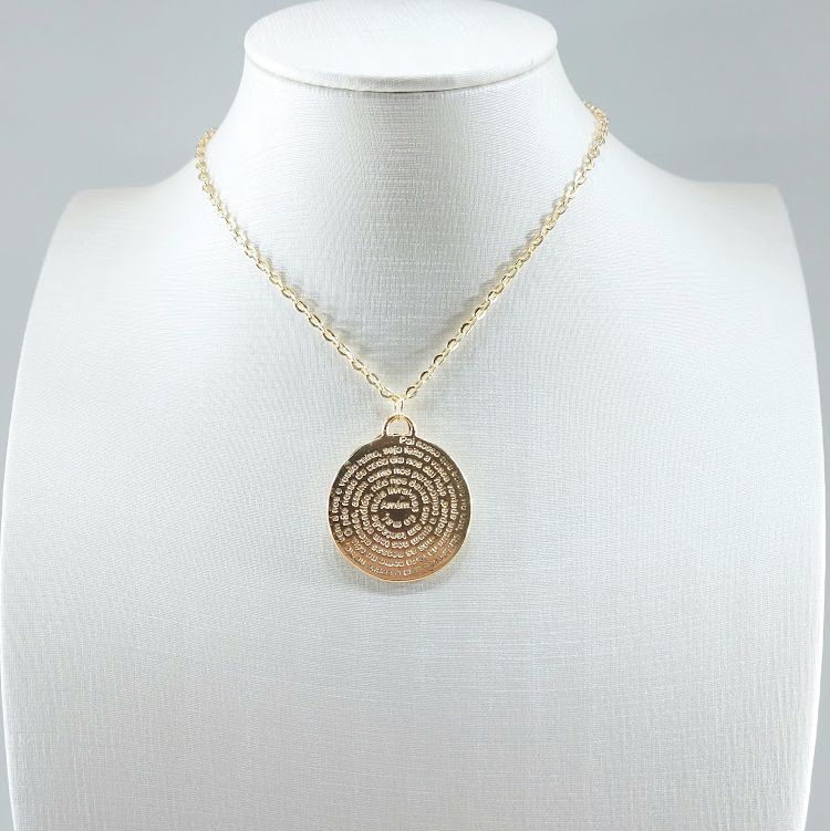 Corrente dourada com medalha gravada com a oração do Pai Nosso, unindo significado e elegância em um design atemporal.