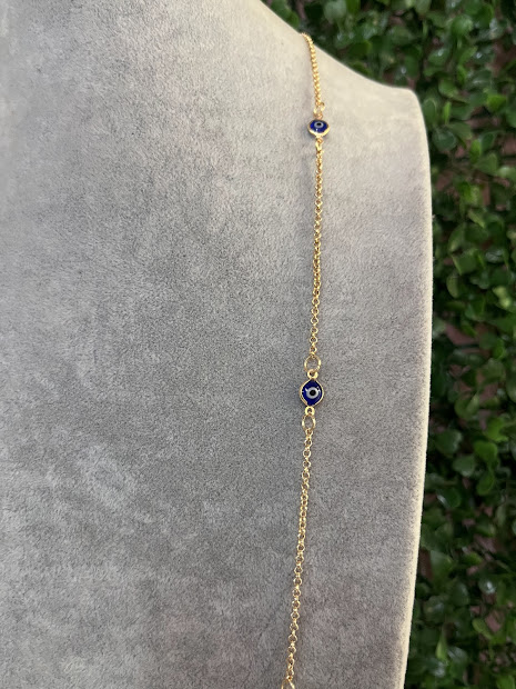 Corrente longuinha com delicados olho grego, que pode ser usado somente ela ou em conjunto com outra peça mais curta, trazendo um toque moderno e elegante para compor diferentes produções.