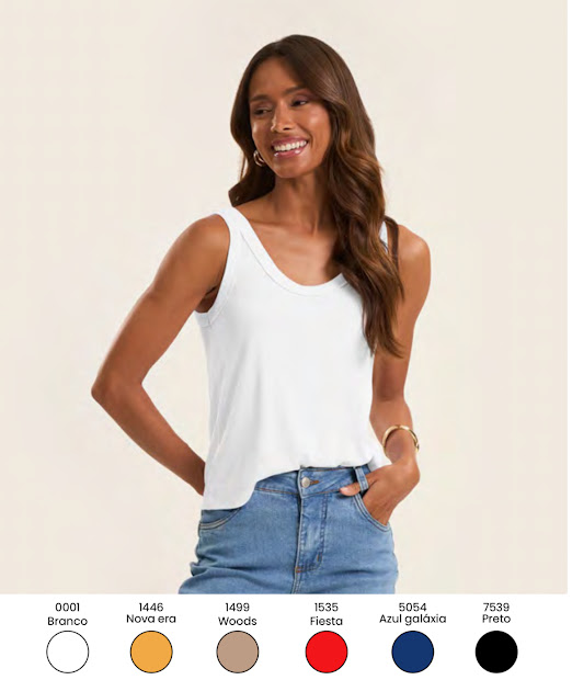 Regata básica confeccionada em ribana de viscose, que oferece toque macio, elasticidade e excelente caimento.
