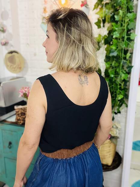 Regata em crepe com decote em V que alonga a silhueta e alças largas para mais conforto e sustentação.
