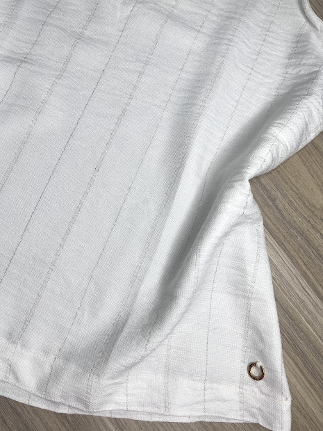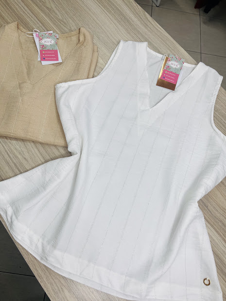 Regata moderna, confeccionada em tecido leve com listras em lurex que adicionam brilho discreto à peça.