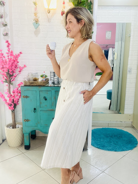 Saia midi confeccionada em linho listrado, com forro interno que garante conforto e segurança ao vestir.